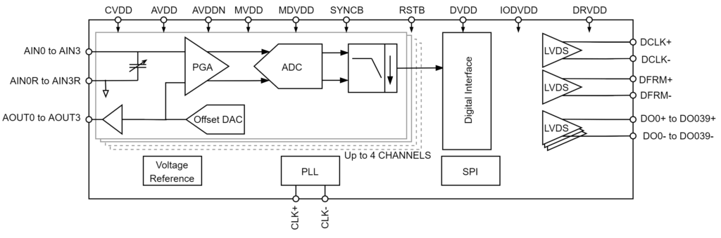 Up to 4 channels, up to 16-bit resolution, sampling-rate up to 5 Gsps, digitally-selectable 3dB bandwidth up to 300MHz, integrated single-to-differential amplifier & offset DAC